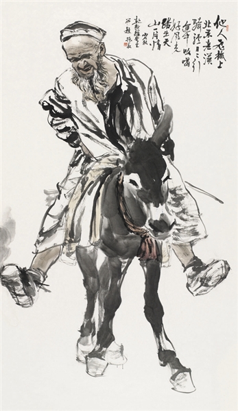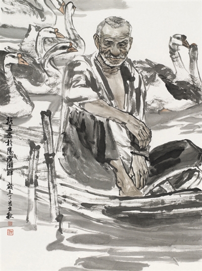 几十年来,刘振夏孜孜以求的便是用笔墨语言来塑造有真实感的人物形象,在人物造型中努力赋予中国传统绘画特有的笔墨情趣。他坚持书法用笔,他的画以线为骨,以点和面为肉,适当敷以淡彩,按照形象的需要,在曲直、长短、粗细、刚柔中,表达各种线的情味和质量感。读刘振夏的画,可以看出他讲究笔触变化产生的力度、节奏,追求墨色变化中的韵味与律动感。他巧妙地掌握造型和笔墨语言的繁简、虚实、浓淡、轻重等对立统一的辩证关系,使画面既有整体感,又有细节的美,而常常用有意和无意之笔,画龙点睛,发出异彩,使画面生辉。