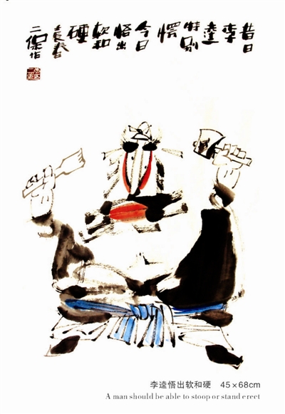 二保有很多总结创作经验的“名言”,如:“什么是水墨漫画?漫画里加点水。”;“气随意走、笔随气行、画随笔成”;“画无内容如人有体无魂,”;“写拙简稳松、无我一场空”等等。这些“名言警句”对当今正在兴起的水墨漫画创作,无论是在画种定位上,还是在绘画技法上,都堪称经典。