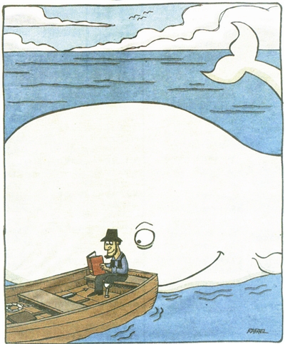 渔夫坐船头细细品读一本好看的书,谁知座头鲸也被精彩内容吸引过来。读者在感慨中祝愿:人类和动物和谐相处吧!
