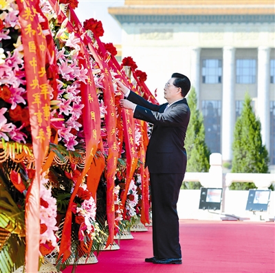 10月1日上午,在首都各界代表向人民英雄纪念碑敬献花篮仪式上,中共中央总书记、国家主席、中央军委主席胡锦涛神情庄重地整理花篮上的红色缎带,向人民英雄表示崇高敬意。新华社发