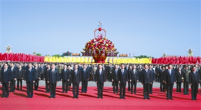 10月1日上午,党和国家领导人胡锦涛、吴邦国、温家宝、贾庆林、李长春、习近平、李克强、贺国强、周永康等,与首都各界代表一起,向人民英雄纪念碑敬献花篮。