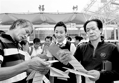 10月7日,南昌铁路局福州客运段乘务员为旅客发放列车时刻表。
