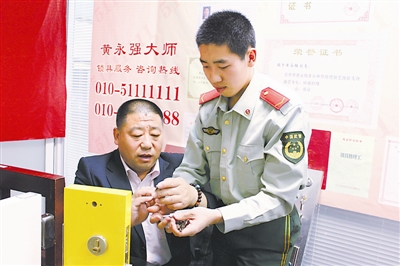 眼前这个“90后”小战士黄禄通,跟他爸长得很像,看见他就仿佛看见了30年前的“锁王”黄永强,当然,那时候的黄永强还称不上什么“锁王”,只是一个在鞍山辞了工作在街头摆摊修锁配钥匙的小个体户。而今,47岁的黄永强门徒四千,拥有28项防盗锁具和开锁工具专利,不仅牵头制定了国家《锁具修理工》的职业标准,而且还被北京市政府授予劳动模范和“中华传统技艺技能大师”称号;作为唯一的锁具专家,他被公安部聘请为全国公安部门侦查系统的警察讲课,堪称中国锁匠第一人。