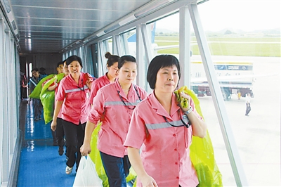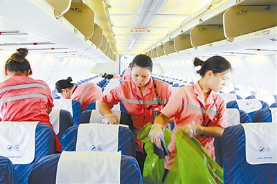 飞机和廊桥刚刚对接好,清洁员们便从快速通道登上廊桥,站在机舱门口等待旅客下机。当最后一名乘客走出机舱后,他们迎着空姐甜美的微笑迅速奔赴各个岗位:清理卫生间、收拾座位上的垃圾、更换毛毯、清扫地板、整理报纸杂志、调整坐椅靠背……几分钟后,原本凌乱的客舱被她们收拾得焕然一新。