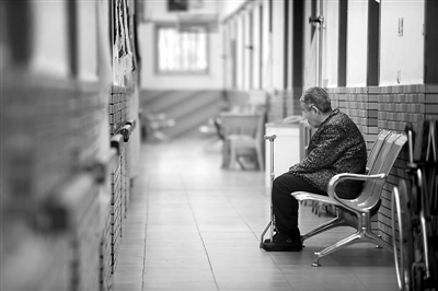 北京,大兴泰富春老年公寓。一位患老年痴呆的老人独自坐在走廊里。这个私人办的养老院,建筑为单层的平方,已经办了十几年了,属于较早的一家。很多养老院里,混住、护工短缺和医疗缺位,把很多老人从对养老院专业、温馨的想象拉回了现实。