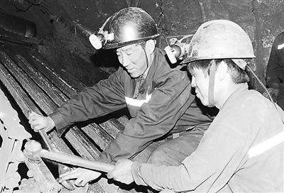 10月8日,河北冀中能源邯矿集团郭二庄矿综采一区班长郝彦明(左二)自制的煤矸分离筛经一个月的试验后,这天终见理想效果:每天排矸120罐360吨左右,含矸率降低15%以上,还解决了煤仓口堵塞等难题。该分离筛采用废旧道轨制作,长3米、宽2米,安装至煤仓下口处45度,矸石落在分离筛上后,自动滑落溜槽中,实现煤矸自动分离。 王志强 摄