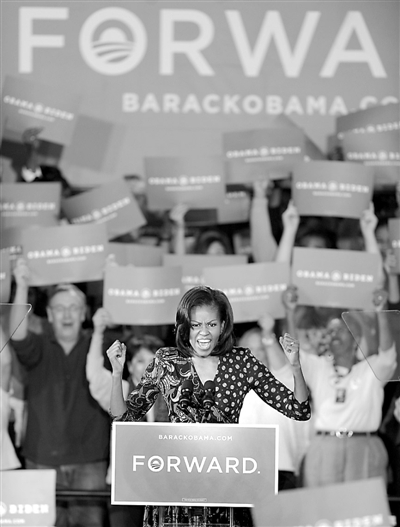 10月9日,在美国弗吉尼亚州劳顿县,美国第一夫人米歇尔·奥巴马举行竞选造势活动,为丈夫奥巴马助选。美国知名民调机构盖洛普公司10月8日公布最新民调结果显示,在美国总统候选人3日举行首场辩论后,共和党候选人罗姆尼民意支持率追平总统奥巴马。