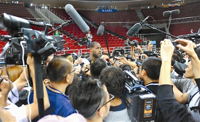 10月10日,前来北京参加2012NBA中国赛前瞻的迈阿密热队训练后,詹姆斯接受采访。 CFP供图