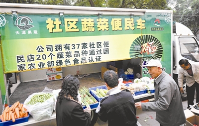 10月11日,甘肃省兰州市城关区的老人们按照“虚拟养老院”提供的时间和地点到流动售菜车买菜。
