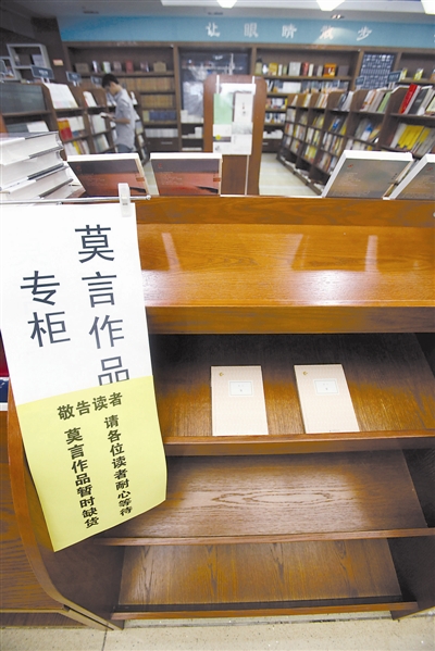 10月12日,浙江宁波书城临时开设的莫言作品专区仅剩下最后两本书。书店贴出了“莫言作品暂时缺货,请读者耐心等待”的告示。