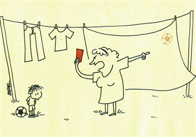足球小将弄脏了邻居家的床单,怒不可遏的阿姨使出赛场规则:红牌罚下,暂停踢球。这种“制裁”真是有理、有力、有节。