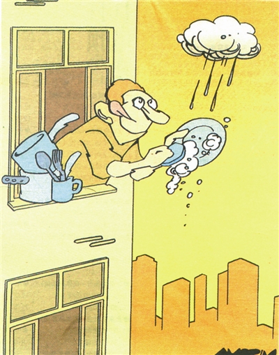 开源节流是解决缺水的好办法,人们须充分利用点滴水资源。看似漫画作者的构思有些“幻想”,不过梦想成真的事经常出现。