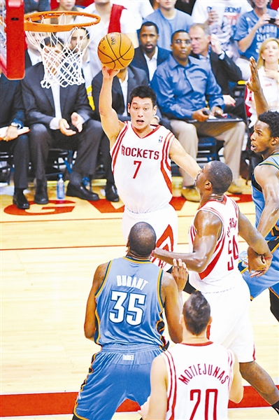 当地时间10月10日,火箭队首场NBA季前赛在美国休斯敦打响,最终火箭队以107比105力克俄克拉荷马雷霆。图为林书豪上篮。
