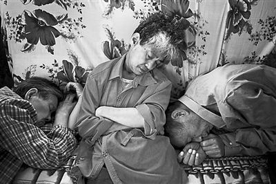几个晚上不愿睡觉的老人一起靠在沙发上睡觉,他们的世界里,黑夜和白昼的概念并不那么明显。