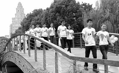 10月13日,一对对参加苏州市重点工程建设者集体婚礼的新人牵手走过中央公园桥。