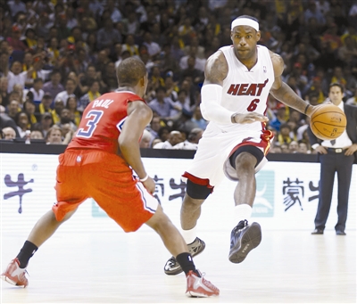 10月14日,热火队球员詹姆斯(右)突破快船队球员保罗的防守。当日,2012年NBA中国赛第二站在上海打响,快船队报了北京失利的一箭之仇,以99比89击败热火队。