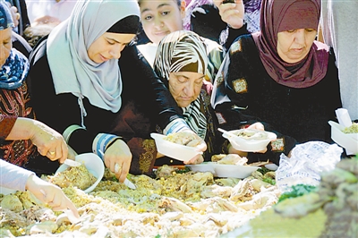 巴勒斯坦妇女协会10月13日在约旦河西岸城市拉姆安拉举行美食活动,将直径5米的圆盘装满由当地妇女烹制的巴勒斯坦特色食品,供数百人食用,以此呼吁人们支持巴勒斯坦妇女活动。吉平 供图