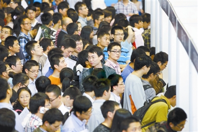 10月15日,中国航天科技集团下属的80多家企业带着1000多个岗位来到南京航空航天大学举行招聘会,吸引了大批飞行器类、电子类和通讯信息类等学科本、硕专业的大批毕业生前来求职应聘。中国航天事业取得了举世瞩目的成绩,开启了更多年轻人的航天梦想。图为航天器企业的摊位前围满了人。