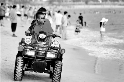 在三亚大东海海边熙熙攘攘的游客中,经常会看到这样的一些年轻人:他们戴着墨镜、皮肤黝黑、体格健壮,或驾驶着沙滩摩托车、摩托艇穿梭,或在海滩上巡逻;时而大声喊话,时而吹起哨子示警……他们就是游客们的安全卫士——泳区救生员。据介绍,最近几年,救生队每年从海中救起的游客都在400人以上。新华社记者 侯建森 摄