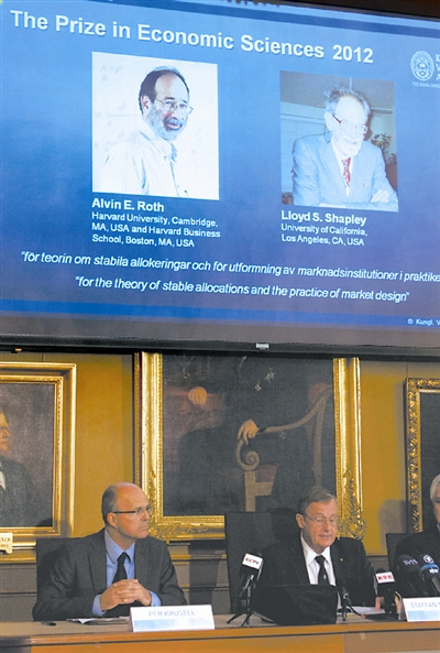 10月15日,瑞典皇家科学院宣布将2012年诺贝尔经济学奖授予美国经济学家阿尔文·罗思和劳埃德·沙普利,以表彰他们在“稳定匹配理论和市场设计实践”上所作的贡献。 新华社记者 刘一楠 摄