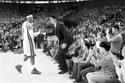 图为在10月14举行的NBA中国赛上,詹姆斯同坐在场边的姚明击掌致意,两人都是NBA在中国赚钱的“卖点”。CFP供图
