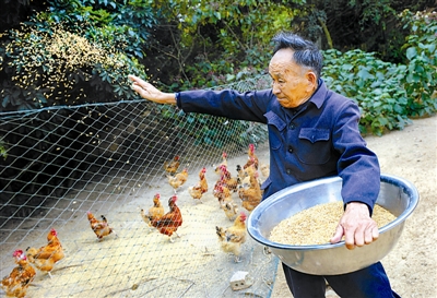 10月17日,83岁的“诚信老爹”吴乃宜在喂鸡。坚持替儿还债的浙江温州苍南县“诚信老爹”吴乃宜一家人,目前已基本还清所欠80多万元旧债。他们感谢众多好心人的帮助,并表示将不再接受社会捐款。