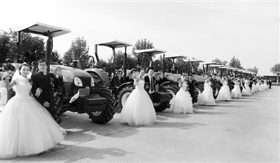 10月10日,中国一拖集团公司工会为15对新人举办集体婚礼。热闹的婚礼庆典结束之后,新人和他们的亲友先后参观了东方红农耕博物馆和大轮拖生产线,洁白的婚纱与鲜红的“东方红”拖拉机构成了一幅美丽的画卷。刘景梅 摄