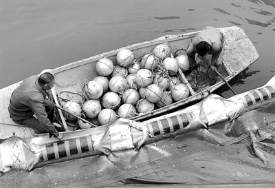 为净化内河水质,江苏连云港市采用生物高分子控藻治污,于近日在市区西盐河朝阳桥至华北桥段投放约7万平方米的生物高分子材料渔网。这种高分子材料具有显著的生物特性,使用后的残留物还可以作为鱼类饵料,完全纳入大自然代谢循环系统,以净化水质预防河水黑臭。图为工作人员正在查看控藻治污情况。