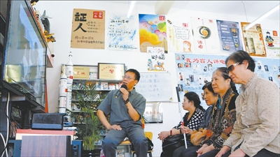 王伟力(左一)正在绘声绘色地为盲人“讲电影”。“心目影院”的运转尽管困难重重,但王伟力始终没有放弃,始终竭尽全力。