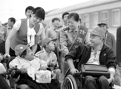 10月18日,20名到杭州考察创业项目的残障人士乘坐2595次列车返回河南新乡。一路上的阳光感受让他们重拾了对生活的信心,尤其是为他们出行提供全程无障碍服务的郑州铁路局,不仅为他们办理了往返的卧铺车票,将铺位调整至方便行动的下铺,同时为行动不便的部分旅客提供一对一的就餐、洗漱到铺服务。图为车站工作人员正将残疾旅客通过无障碍通道送上列车。祝庆 摄