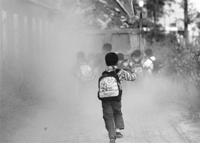 ▲10月8日,响水滩小学学生走在放学回家的路上。一辆货车驶过,泛起一阵灰,孩子们像是找到了乐趣,追着货车跑,将自己置身于“白雾”中。城里的孩子见了灰就躲,但对于这些留守儿童来说,“追灰尘”也成了一种乐趣。