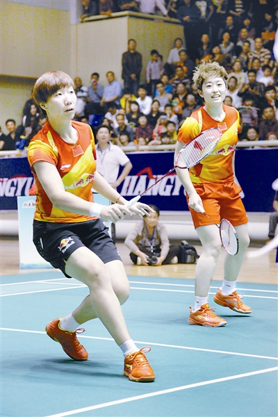 在当晚举行的开幕式上, 观众们还欣赏到了世界冠军组合于洋/ 王晓理与浙江羽毛球队队员李晓/潘贝贝间的超级挑战赛。图为于洋/王晓理在比赛中。