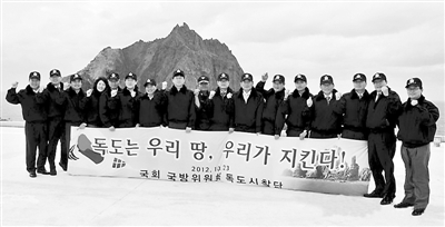 10月23日在独岛(日本称竹岛),韩国国会国防委员会的17名议员身着制服登上该岛,并拉起“独岛是韩国领土,我们捍卫独岛”的标语。