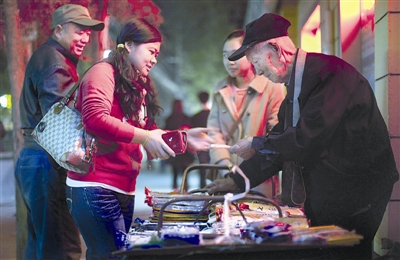 10月24日傍晚,当王振荣老人推着小车,准时出现在北京中国传媒大学西门时,等候买鞋垫的该校学生马上围住了他。他们通过微博知道老人已经102岁,就动了来买鞋垫的想法。许多学生一买就是两双,放下10块钱即离开。