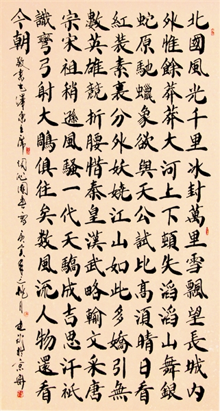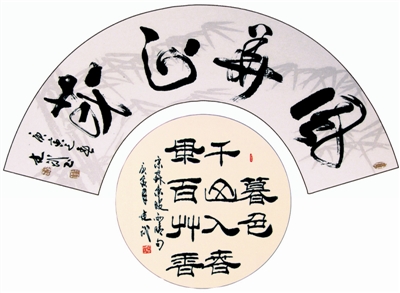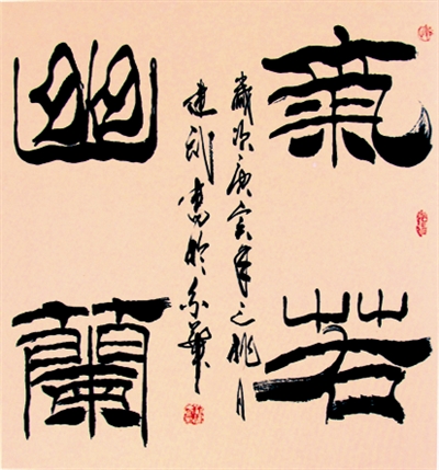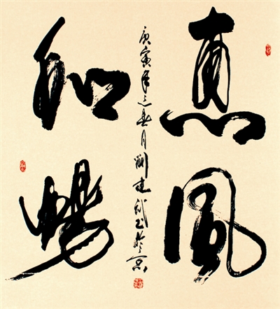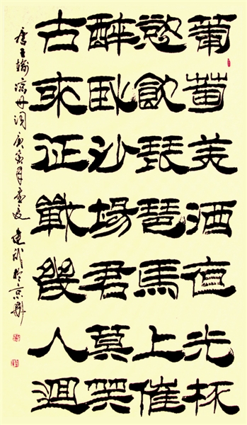 刘建武临的第一本书帖是《曹全碑》,正是这本《曹全碑》,为刘建武打开了通往书法艺术殿堂的大门。他从《曹全碑》入帖,得端庄基础,又用功于唐楷,承《淳化阁帖》之潇洒。《九成宫醴泉帖》的圆畅方挺,《孔子庙堂碑》的潇洒跌宕,都让他如痴如醉。刘建武最早喜欢颜体,他认为颜氏忠义之节、豪放之气出于天性,观颜氏正书,“体严法备,如忠臣义士,正色立朝,临大节而不可夺。”30多年的军旅生涯,让刘建武深刻体会到颜氏正书“忠义光明”的真正内涵和分量。为此,他潜心研习,反复临帖,功夫日厚,其颜氏榜书“书道千秋”曾在全军后勤系统书画大赛中受到广泛赞扬和关注。这幅作品字体刚健雍容,横竖勾画,有强弓硬矢之形,整篇书法刚柔相济,令许多观众流连欣赏。