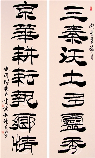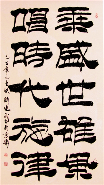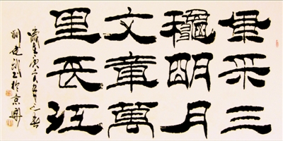 刘建武篆、行、草、楷等书体都具功力,也不时获得大奖。然而,刘建武的隶书最让人兴奋。隶书在汉代是人们主要书写的一种字体,是中华民族文字书写由篆书转向成熟的一个标志和创新,也是中华民族在文字书写上逐步走向成熟的重大转折。刘建武博览众家之长,悉心揣摩隶书之要义,领悟其精髓,加入其心志与感悟,渐渐形成自己的风格。他的作品洒脱飘逸,体骨厚重,参合有各派书体的笔意,同时又有自己个性和意境的张扬,字体端庄英武,体象收放凝度。赏其书法,让人有一种“壮士拔剑,四顾苍茫”的感觉。同时,也总能给我们一种“浑然阵列,筋道玉骨”的美感。