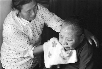 图为欧阳纯凤(左)正在照顾自己的“母亲”朱梦莲。