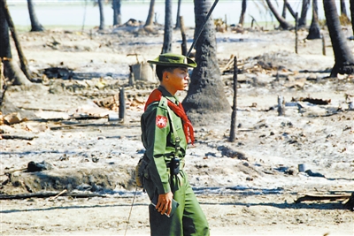 10月27日,一名军人在缅甸若开邦报都镇区巡视。缅甸新闻部官员27日晚说,若开邦骚乱地区局势当天已得到初步控制,但仍有4个镇区发生零星纵火事件,所幸未造成人员死亡。据官方发布的最新统计数据,自10月21日发生新的骚乱以来,共导致67人死亡、95人受伤。骚乱还导致2818间房屋被烧,18座宗教建筑被破坏。 新华社发(吴昂 摄)
