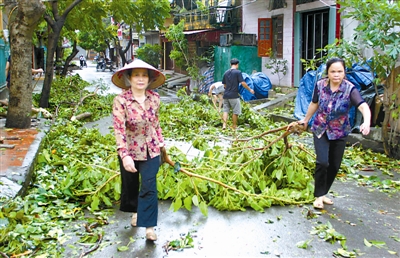 10月29日,在越南北部宁平省省会宁平市,当地居民在清理被台风刮断的树枝。