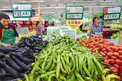 10月29日,文登市区的一家大型超市内,市民正在选购从农户菜园直接配送来的新鲜蔬菜。