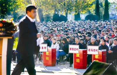 当日上午,在北京通州区永乐店镇的中心广场上,正在举行全镇村党支部书记公开述职大会。38名村支书一一上台述职,台下则坐着镇机关干部、人大代表、村两委干部及农村党员、群众代表共计5000名“考官”。这样的村支书述职大会已经连续举行了6届。新华社记者 张宇 摄