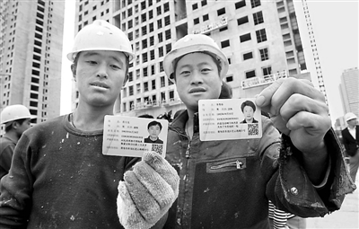 10月29日,青岛民警到工地向外来务工人员发放居住证。当日,在青岛市公安局市北分局小港派出所内,来青岛工作的刘玉强领到了自己的山东省居住证,成为青岛第一个领取到居住证的外来务工人员。同时,民警还到工地向工人发放居住证。何海儿 摄