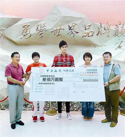 9月29日下午,孙杨、叶诗文、焦刘洋三位奥运游泳冠军接受某公司奖励中国游泳队的300万元人民币。