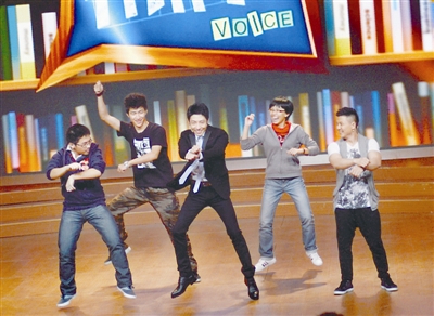 十月二十七日,上海,陈一冰(右一)录制央视主持人撒贝宁的节目时,与撒贝宁跳骑马舞。