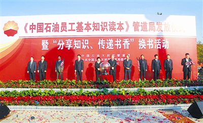 11月1日,《中国石油员工基本知识读本》管道局首次发放仪式暨“分享知识 传递书香”换书活动在河北省廊坊市举行,中国石油天然气集团公司副总经济师、思想政治工作部主任关晓红和管道局局长赵玉建等为管道局员工发放《中国石油员工基本知识读本》十册丛书,并在“分享知识 传递书香”换书活动中与员工们互换数本图书。
