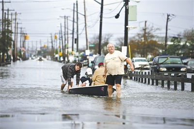当地时间2012年10月30日,美国纽约,居民用小船通过被洪水淹没的街道。CFP供图