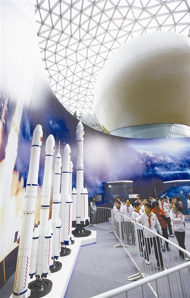 11月2日,少先队员们在展览上参观“长征”系列运载火箭的模型。