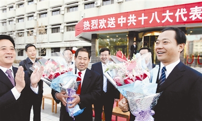11月2日,在党的十八大隆重召开之际,新疆克拉玛依市、新疆油田公司举行仪式,欢送十八大代表克拉玛依钻井公司50585钻井队党支部书记吴平河等赴京参会,并请代表们捎去油田人对十八大的祝福。 周建玲 摄