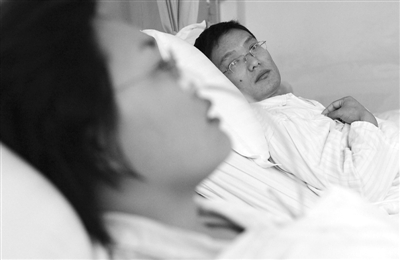 10月31日,北京解放军309医院,手术即将开始,丈夫田新丙(右)望着同样躺在病床上的妻子苏丹(左)。今年8月,已经离婚两个月的田新丙被查出肝硬化中晚期,并伴有新生小肝癌。得知消息的前妻苏丹决定和田新丙复婚并为丈夫捐肝。