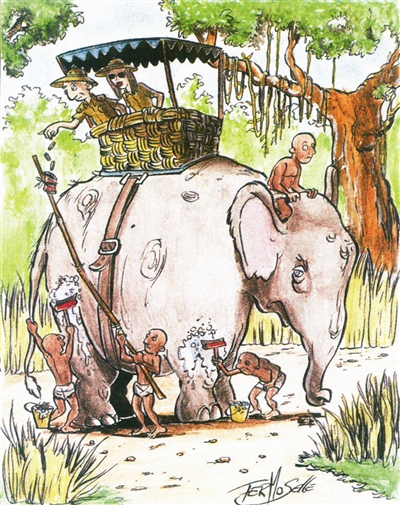 热带丛林中以象代步,乘客与动物相依为伴,主人雇来清洁工清洗打理。“车”身上下干干净净,轻松走路何愁万里行程?